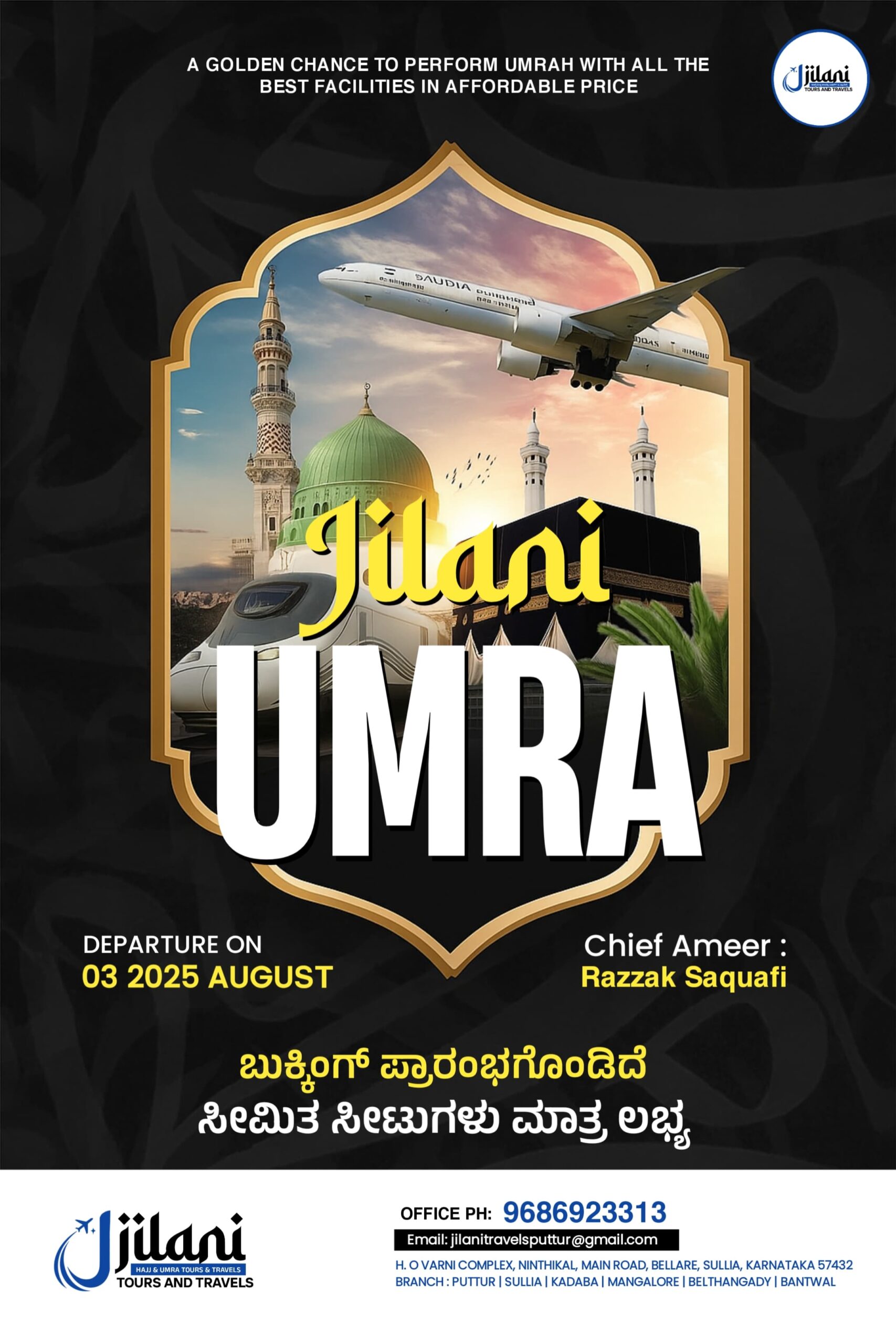 ಜಿಲಾನಿ ಟೂರ್ಸ್ & ಟ್ರಾವೆಲ್ಸ್ ನಿಂದ ಆಗಸ್ಟ್ 3 ಕ್ಕೆ 2 ಬ್ಯಾಚ್ ಹೊರಡಲಿದೆ . ಉಮ್ರಾ ಯಾತ್ರಿಕರಿಗೆ ನೀಡುತ್ತಿದೆ . ಹಲವು ವಿಶೇಷ ಸೌಲಭ್ಯಗಳು . ಬುಕ್ಕಿಂಗ್ ಪ್ರಾರಂಭ ಗೊಂಡಿದೆ .