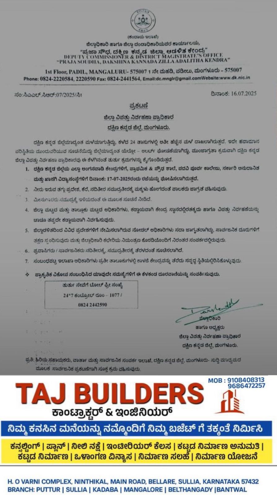 ದ.ಕ ಜಿಲ್ಲಾದ್ಯಂತ ನಿಲ್ಲದ ಮಳೆ : ಜಿಲ್ಲೆಯ ಎಲ್ಲಾ ಅಂಗನವಾಡಿ, ಶಾಲೆ ಮತ್ತು ಪಿ ಯು ಕಾಲೇಜುಗಳಿಗೆ ನಾಳೆ (17/07/2025) ಜಿಲ್ಲಾಧಿಕಾರಿ ರಜೆ ಷೊಷಣೆ.