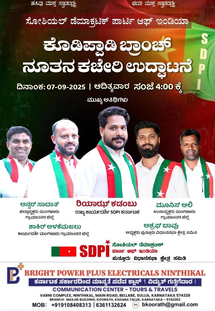 ಎಸ್ಡಿಪಿಐಕೊಡಿಪ್ಪಾಡಿಬ್ರಾಂಚ್. ಸಮಿತಿ ನೂತನ ಕಛೇರಿ ಉದ್ಘಾಟನಾ ಕಾರ್ಯಕ್ರಮಕ್ಕೆ ಭಾಗವಹಿಸುತ್ತಿರುವ ಎಸ್ಡಿಪಿಐ ರಾಜ್ಯ ಕಾರ್ಯದರ್ಶಿ ರಿಯಾಝ್ ಕಡಂಬು, ಮಂಗಳೂರು ಗ್ರಾಮಾಂತರ ಜಿಲ್ಲಾಧ್ಯಕ್ಷರಾದ ಅನ್ವರ್ ಸಾದತ್ ಬಜತ್ತೂರು, ಉಪಾಧ್ಯಕ್ಷರಾದ ಮೂನಿಸ್ ಅಲಿ, ಕಾರ್ಯದರ್ಶಿ ಶಾಕಿರ್ ಅಳಕೆಮಜಲು ಅಧ್ಯಕ್ಷರು ಪುತ್ತೂರು ವಿಧಾನಸಭಾ ಕ್ಷೇತ್ರ ಸಮಿತಿ ಅಶ್ರಫ್ ಬಾವು ರವರಿಗೆ ಹಾರ್ದಿಕ ಸ್ವಾಗತ.