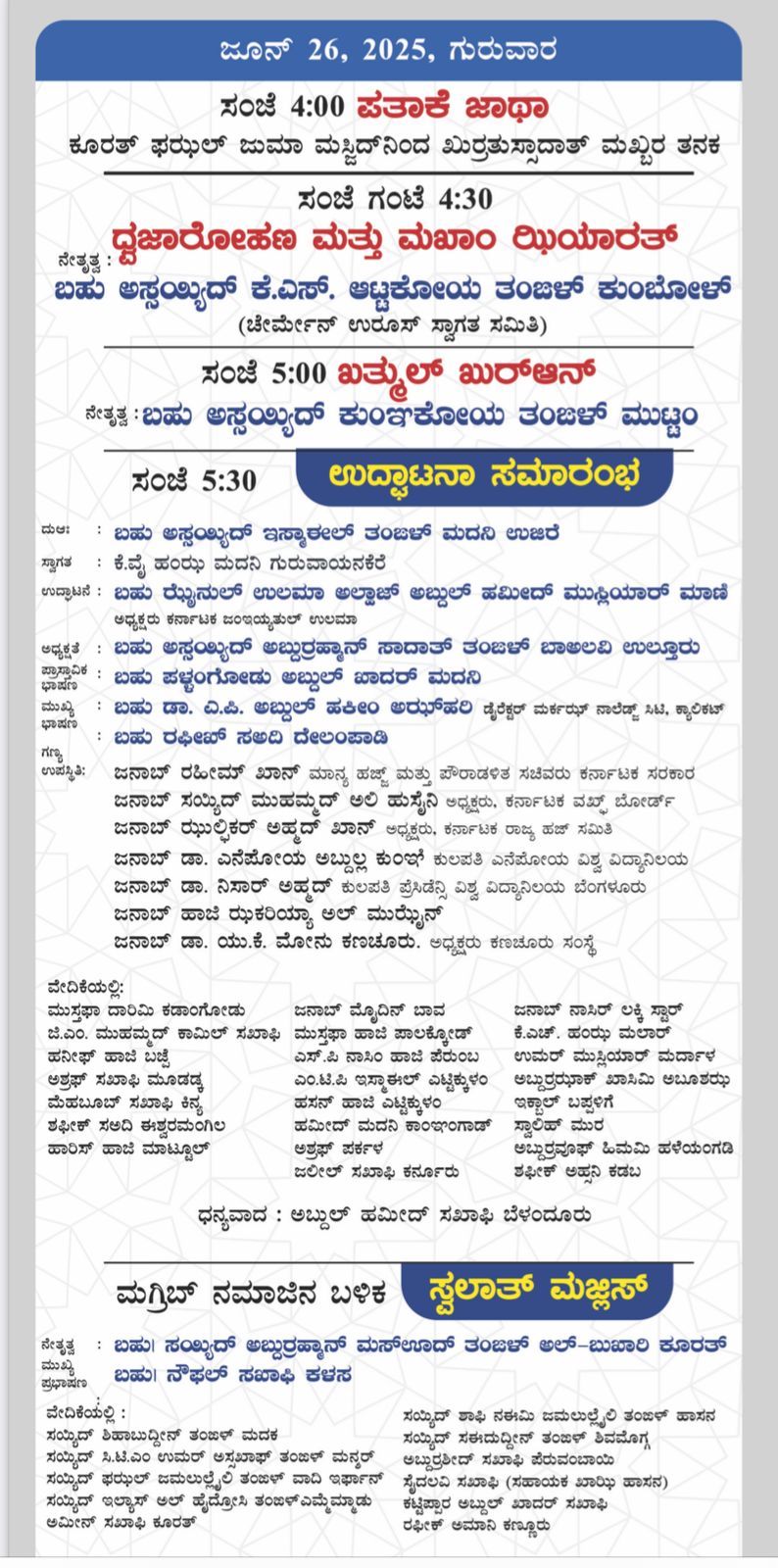 ಇಂದಿನಿಂದ ಖುರ್ರತುಸ್ಸಾದಾತ್ ಪ್ರಥಮ ಉರೂಸ್ . ಸಂಜೆ ಗಂಟೆ 4:30 ಧ್ವಜಾರೋಹಣ ಮತ್ತು ಮಖಾಂ ಝಿಯಾರತ್ ಸಂಜೆ 5:00 ಖತ್ಮುಲ್ ಖುರ್ಆನ್. ಸಂಜೆ 5:30 ಉದ್ಘಾಟನಾ ಸಮಾರಂಭ ಮಗ್ರಿಬ್ ನಮಾಜಿನ ಬಳಿಕ | ಸ್ವಲಾತ್ ಮಜ್ಲಿಸ್ ।. ನೇತೃತ್ವ : ಬಹು ಮಸ್ಊದ್ ತಂಜಳ್ ಅಲ್-ಬುಖಾರಿ ಕೂರತ್ ಪ್ರಭಾಷಣ: ಬಹು ನೌಫಲ್ ಸಖಾಫಿ ಕಳಸ.