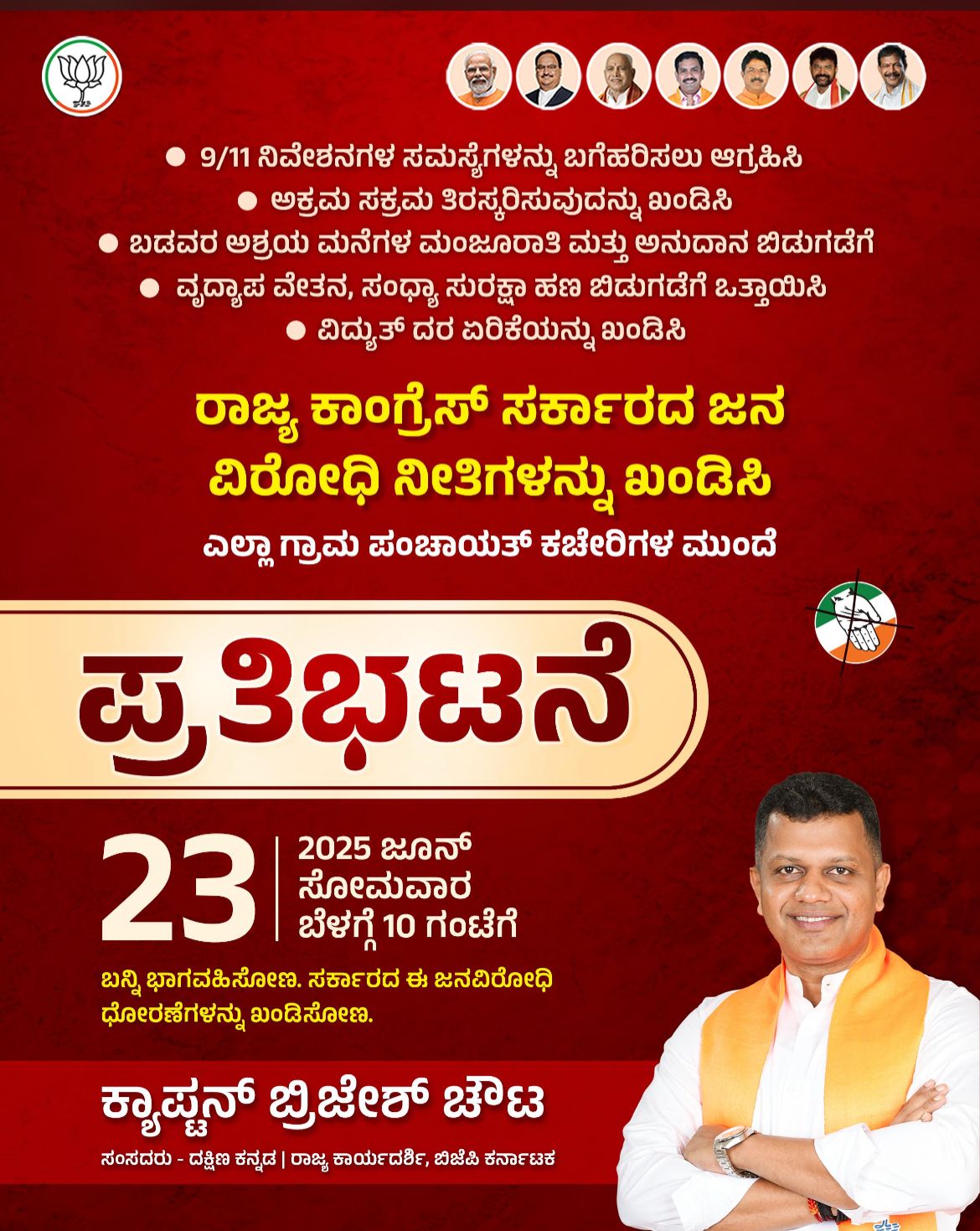 ರಾಜ್ಯ ಕಾಂಗ್ರೆಸ್ ಸರ್ಕಾರದ ಜನ ವಿರೋಧಿ ನೀತಿಗಳನ್ನು ಖಂಡಿಸಿ ಎಲ್ಲಾ ಗ್ರಾಮ ಪಂಚಾಯತ್ ಕಚೇರಿಗಳ ಮುಂದೆ ಪ್ರತಿಭಟನೆ. ಸರ್ಕಾರದ ಈ ಜನವಿರೋಧಿ ಧೋರಣೆಗಳನ್ನು ಖಂಡಿಸೋಣ. ಕ್ಯಾಪ್ಟನ್ ಬ್ರಿಜೇಶ್ ಚೌಟ