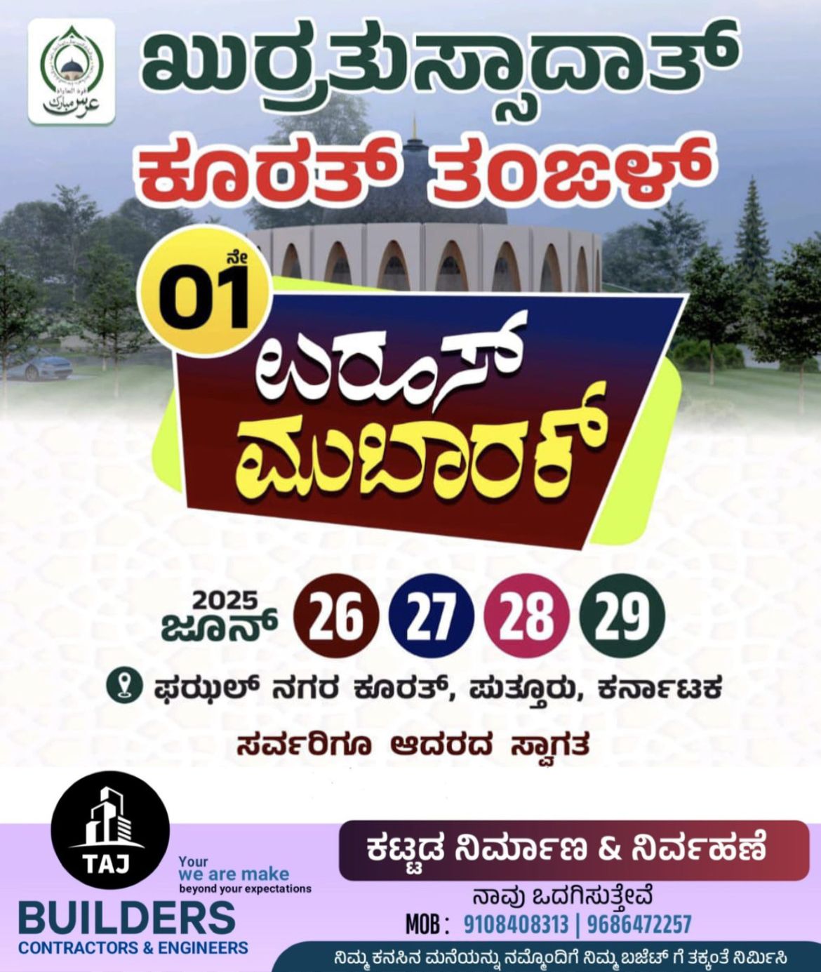 ಕೂರತ್ ತಂಙಳ್ ಪ್ರಥಮ ಉರೂಸ್ ಕಾರ್ಯಕ್ರಮವು ಇದೇ ಬರುವ ದಿನಾಂಕ : 26 ರಿಂದ 29 ರ ತನಕ ನಡೆಯಲಿದೆ . ತಾವೆಲ್ಲರೂ ಮಹಾನ್ಮರಾದ ಕೂರ ತಂಞಲ್ ರವರ ಈ ಉರೂಸ್ ಕಾರ್ಯಕ್ರಮದಲ್ಲಿ ಭಾಗವಹಿಸಿ ಕಾರ್ಯಕ್ರಮವನ್ನು ಯಶಸ್ವೀಗೊಳಿಸಬೇಕು # ರಫೀಕ್ ಎಂ ಎ ಸವಣೂರು  18 ನ್ಯೂಸ್ ಪುತ್ತೂರು . (ರಿಪೋರ್ಟರ್ ).